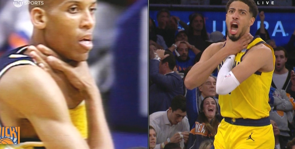 第四节最后时刻步行者落后两分,哈利伯顿撤步投三分嗑筐后神奇掉进篮筐,以为压哨绝杀的他非常兴奋,做出雷吉-米勒经典的扼喉庆祝动作,不过裁判回放确定踩到了三分线,绝杀变成了绝平。