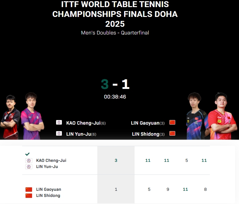 据统计,这是国乒男双50年来首次无缘世乒赛四强,自从1975年世乒赛以来,国乒从未无缘过世乒赛男双奖牌。